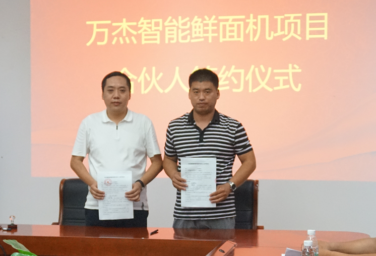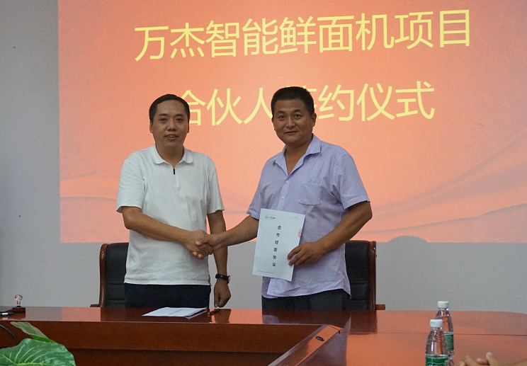 2017年8月4日,萬杰智能總部又迎來山東省兩位合作伙伴,山東省泰安市華任經貿有限公司劉總、山東省曲阜市鑫海商貿有限公司楊總分別與萬杰智能簽署了《智能鮮面機合伙人合作協議》。 此次,泰安、曲阜兩市的加入,標志著萬杰智能鮮面機項目山東市場正式開啟。至此,萬杰智能鮮面機全國招商突飛猛進,赤峰、新鄉、鄭州兩個區域、鶴壁、寧波、義烏、溫州、洛陽、大慶、許昌禹州市、泰安、曲阜相繼加入,全國招商工作屢獲佳績。 萬杰智能董事長王曉杰與山東省泰安市華任經貿有限公司劉總 萬杰智能董事長王曉杰與山東省曲阜市鑫海商貿有限公司楊總 山東省是我國面食大省,尤以打鹵面最為著名和正宗,現制鮮面條的出現,將會為當地百姓面食生活的“安全、健康、營養”創造了更多可能。 得益于主食安全和模式創新,萬杰智能聚集了全國各地的事業合作伙伴,各個城市的合伙人與萬杰智能共同扛起“主食安全”的大旗?梢哉f,獲得收益,充其量只是門生意,而造福百姓,然后讓所有參與者共同受益,這才可稱得上是一份事業。萬杰智能鮮面機項目的合伙人正是這樣一支隊伍,做主食安全,為一方百姓,這份既有擔當,又前景可觀的事業,誠邀全國地區意向合作伙伴。 萬杰智能主食機械——為億萬家庭主食安全服務!