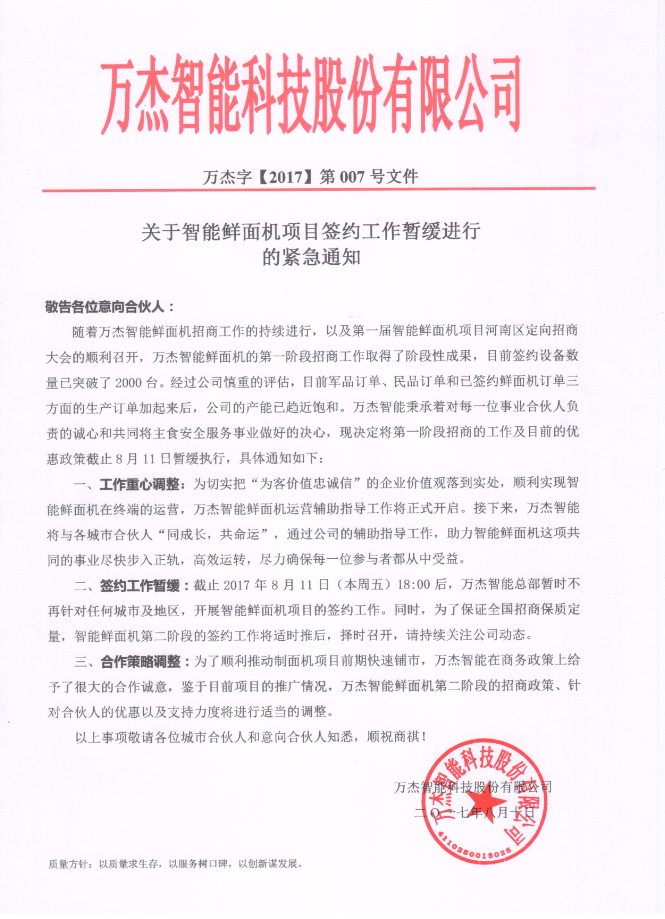 二、簽約工作暫緩截止2017年8月11日(本周五)18:00后,萬杰智能總部暫時不再針對任何城市及地區,開展智能鮮面機項目的簽約工作。同時,為了保證全國招商保質定量,智能鮮面機第二階段的簽約工作將適時推后,擇時召開,請持續關注公司動態。