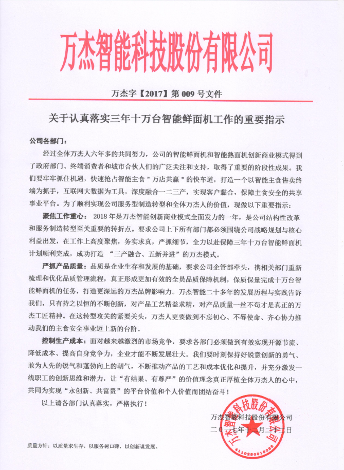 關(guān)于認(rèn)真落實三年十萬臺智能鮮面機(jī)工作的重要指示